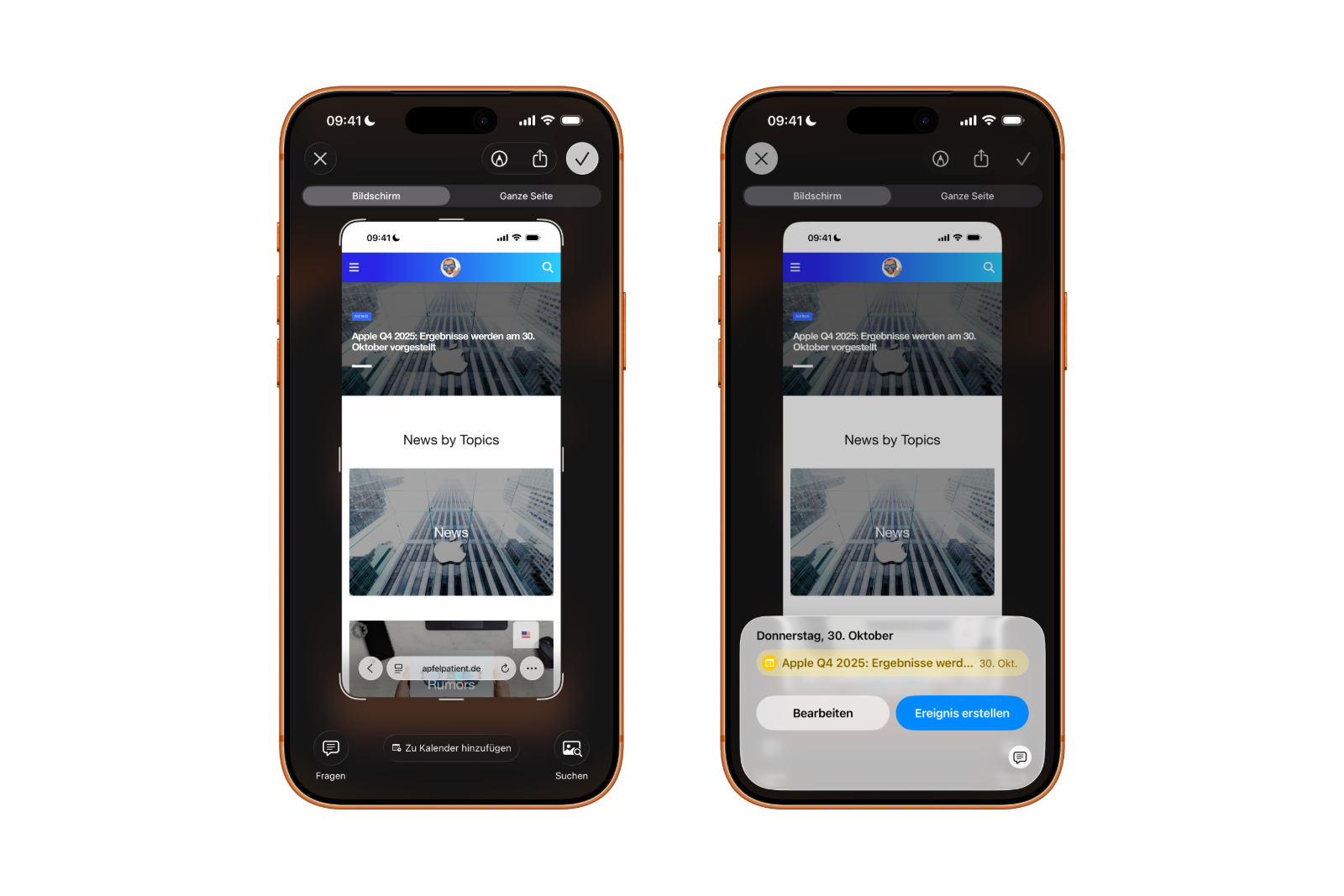 To use Visual Intelligence with screen content, all you need is a screenshot. This is created as usual by simultaneously pressing the side button and the volume up button. As soon as the screenshot interface appears, iOS 26 automatically displays the available Visual Intelligence options. The options available depend on the captured content.